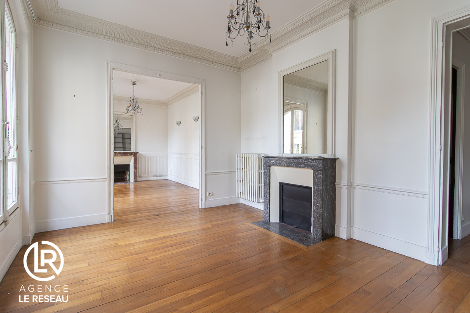 L’appartement en très bon état, au premier étage, lumineux et traversant, sans perte de place bénéficiant d'une belle hauteur sous plafond de 3m, se compose d’une entrée avec rangements, d’un double séjour de 30m² (possibilité seconde chambre) avec parquet, moulures et cheminée, d’une cuisine séparée et équipée, d'une chambre au calme de 12m², d’une salle de bains et d'un WC séparé.