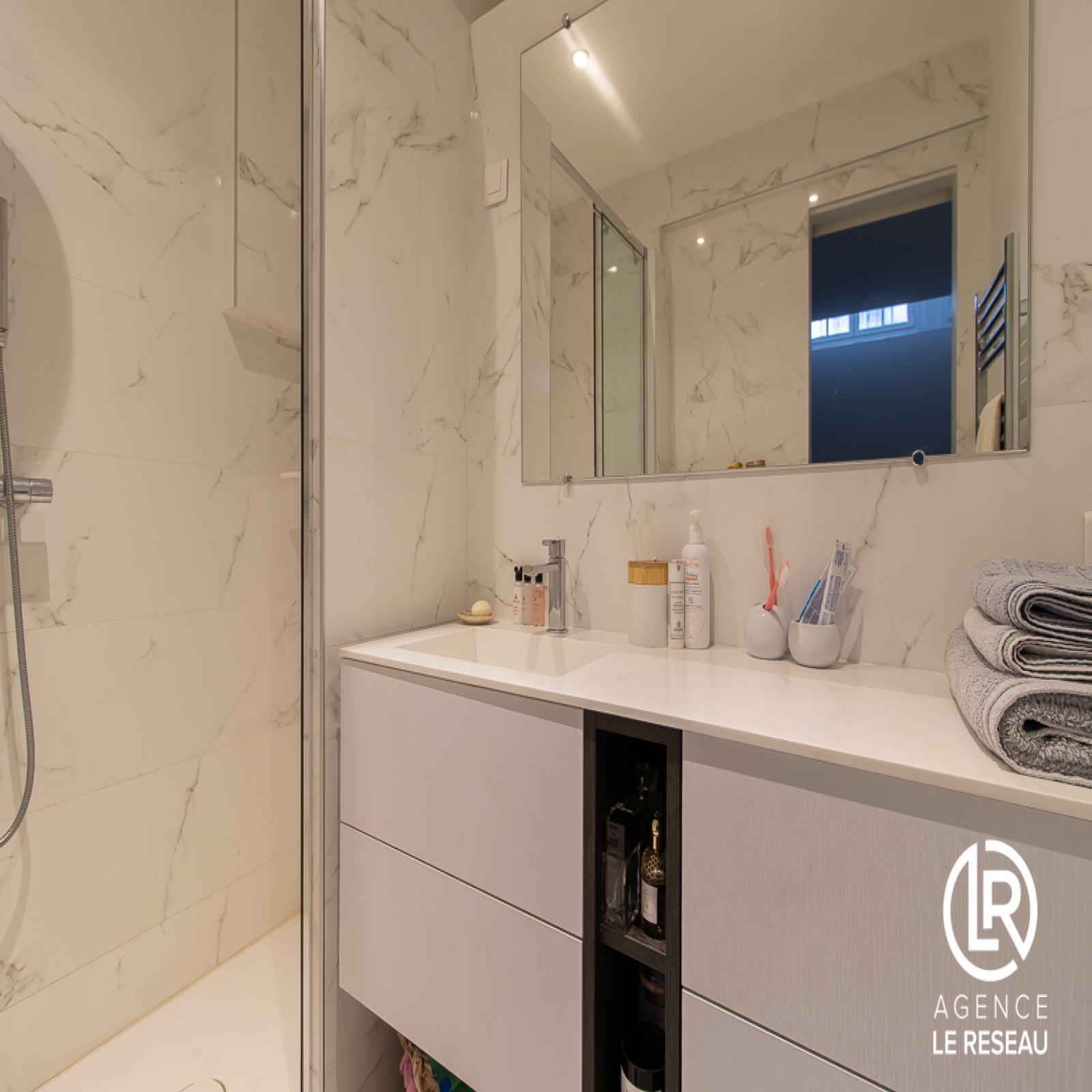 A l'étage se trouve 2 chambres avec rangements et une salle de bains avec WC. A l'étage inférieur se trouve une suite parentale de 16m2, d'une salle d'eau avec WC et un dressing.