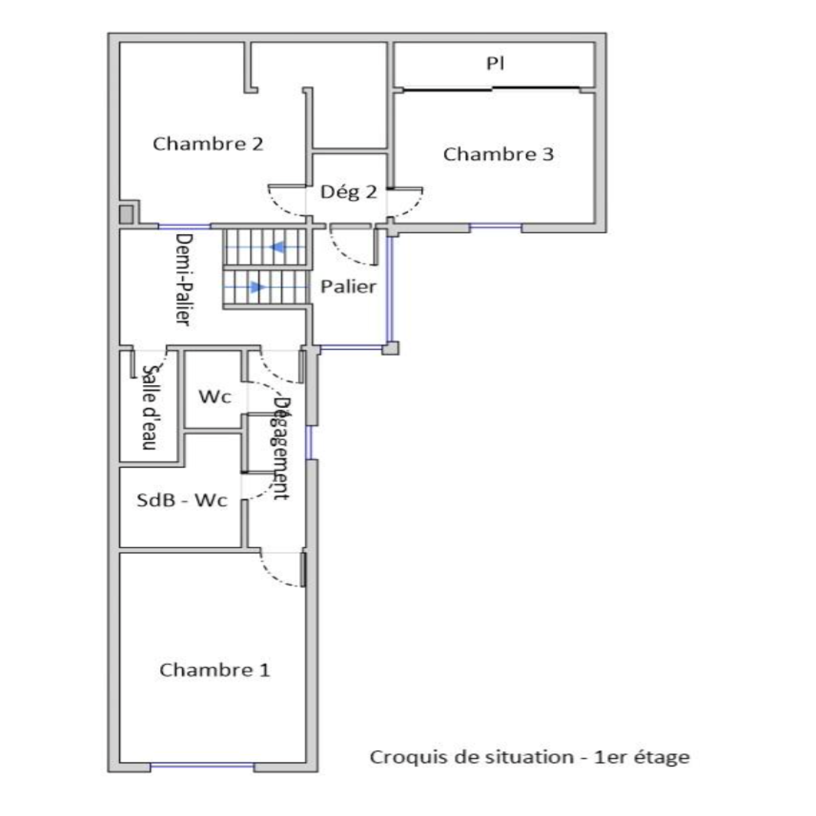 Au deuxième niveau: D'une chambre, d'une salle de bains avec WC, d'une salle d'eau et d'un WC séparé.