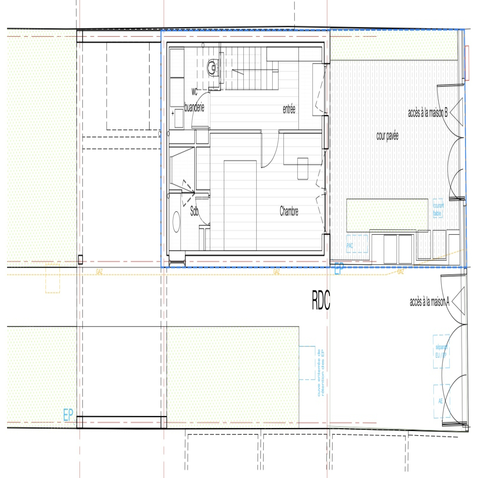 Au rez de chaussée : d’une entrée avec rangements, d'une chambre avec sa salle d'eau, d’une buanderie avec WC et d'une terrasse au calme exposée sud-est.